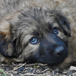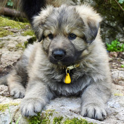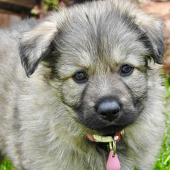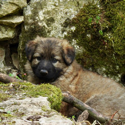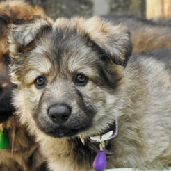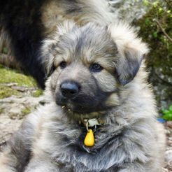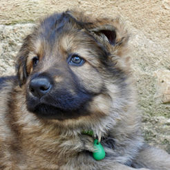 Un p'tit gars bien équilibré avec une jolie bouille bien carrée. Toujours partant pour tout. Très proche de l'humain, il est le premier à trouver une solution de venir nous rejoindre si l'enclos du parc à chiot n'est pas bien fermé ;-)